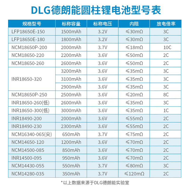 DLG德朗能原厂锂电芯热销型号表,DLG和德朗能中英文品牌归属深圳市德朗能电子科技有限公司,公司未授权除德朗能体系工厂外的其他任何经销商和授权商,请大家认准深圳德朗能。